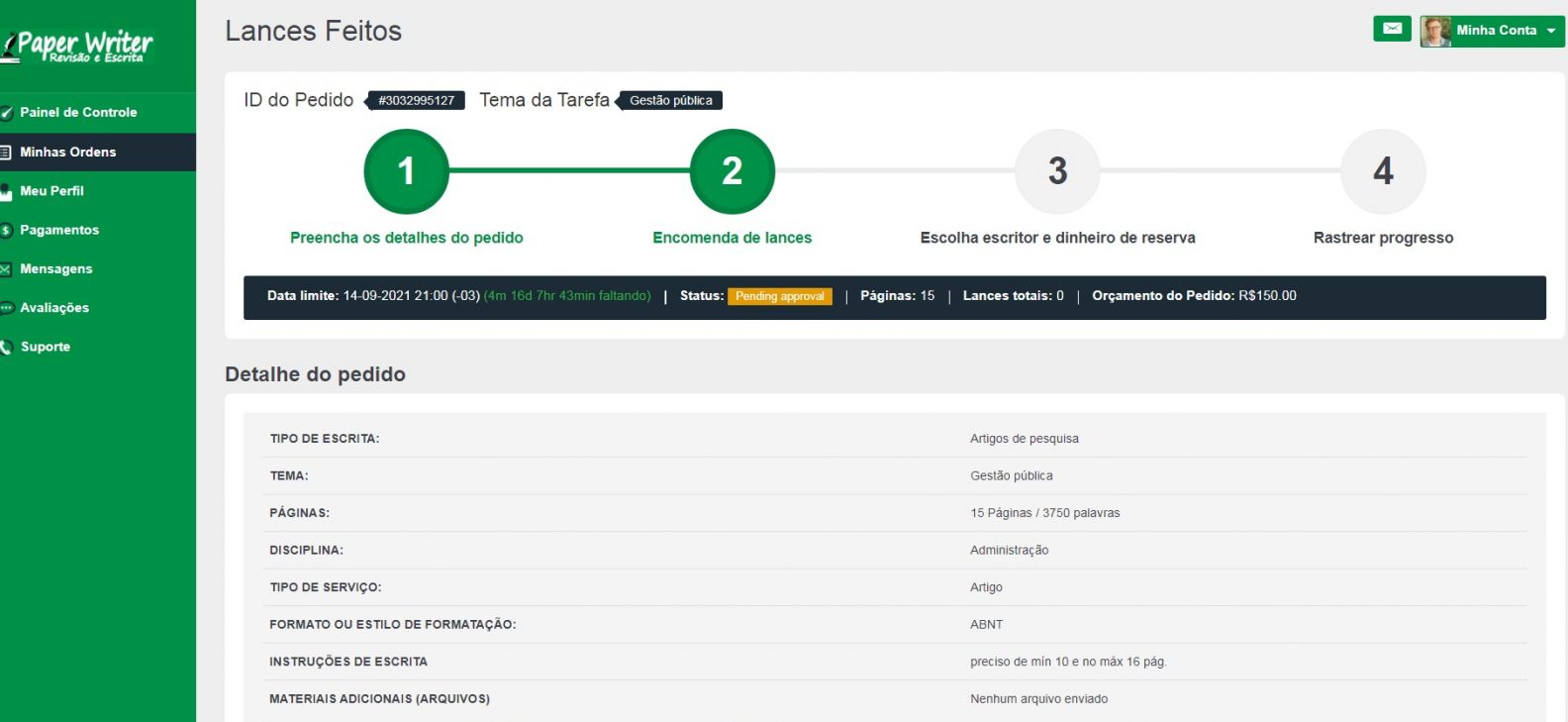Você pode selecionar um escritor adequado com base na classificação por estrelas, nos comentários fornecidos por clientes anteriores e no preço solicitado para o trabalho. O pagamento que você fará ao escritor ficará em reserva com a PaperWriter até o recebimento do seu pedido e ter cumprido o tempo de garantia do serviço prestado, assim, o cliente tem a total garantia de que irá receber pelo serviço ao qual pagou e uma total certeza de que se não cumprido todas as solicitações terá 100% de reembolso.